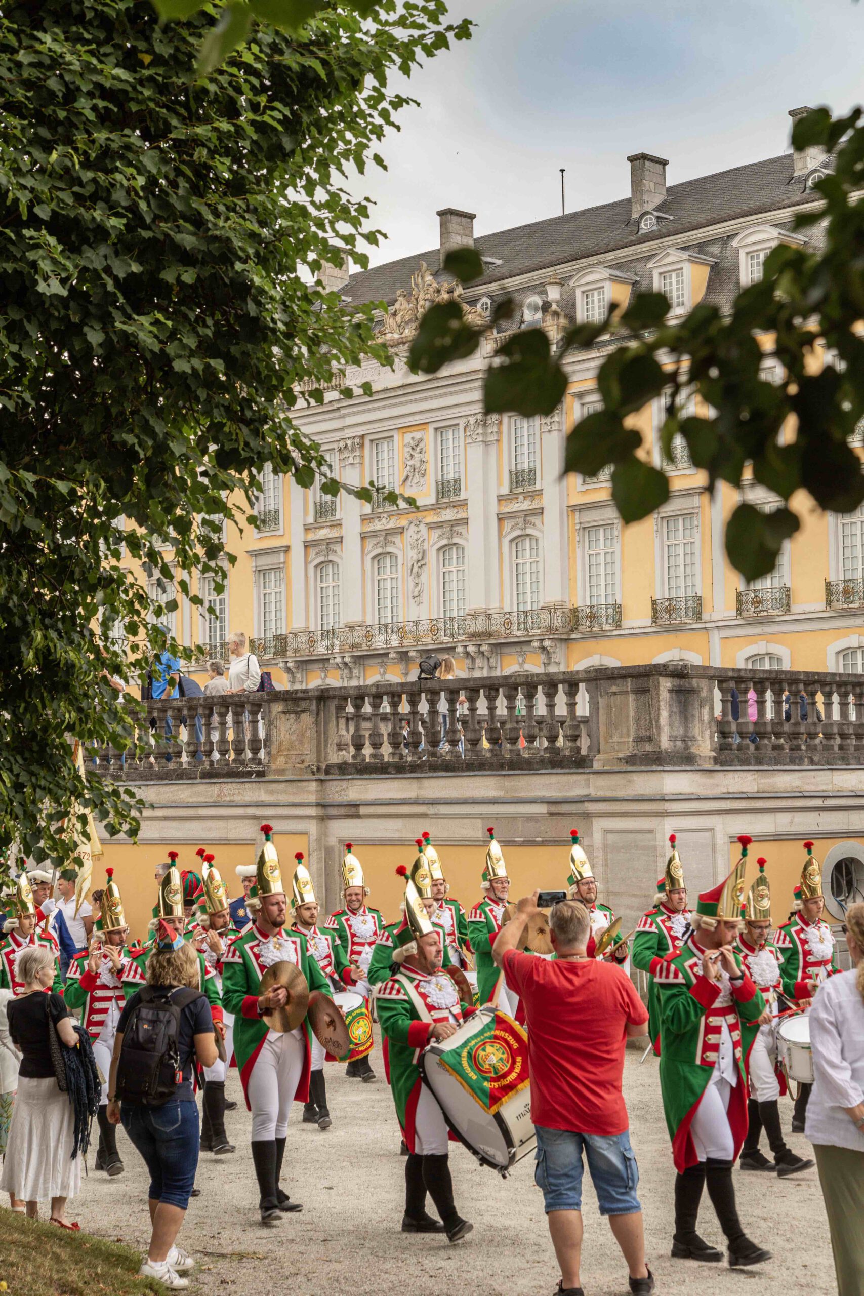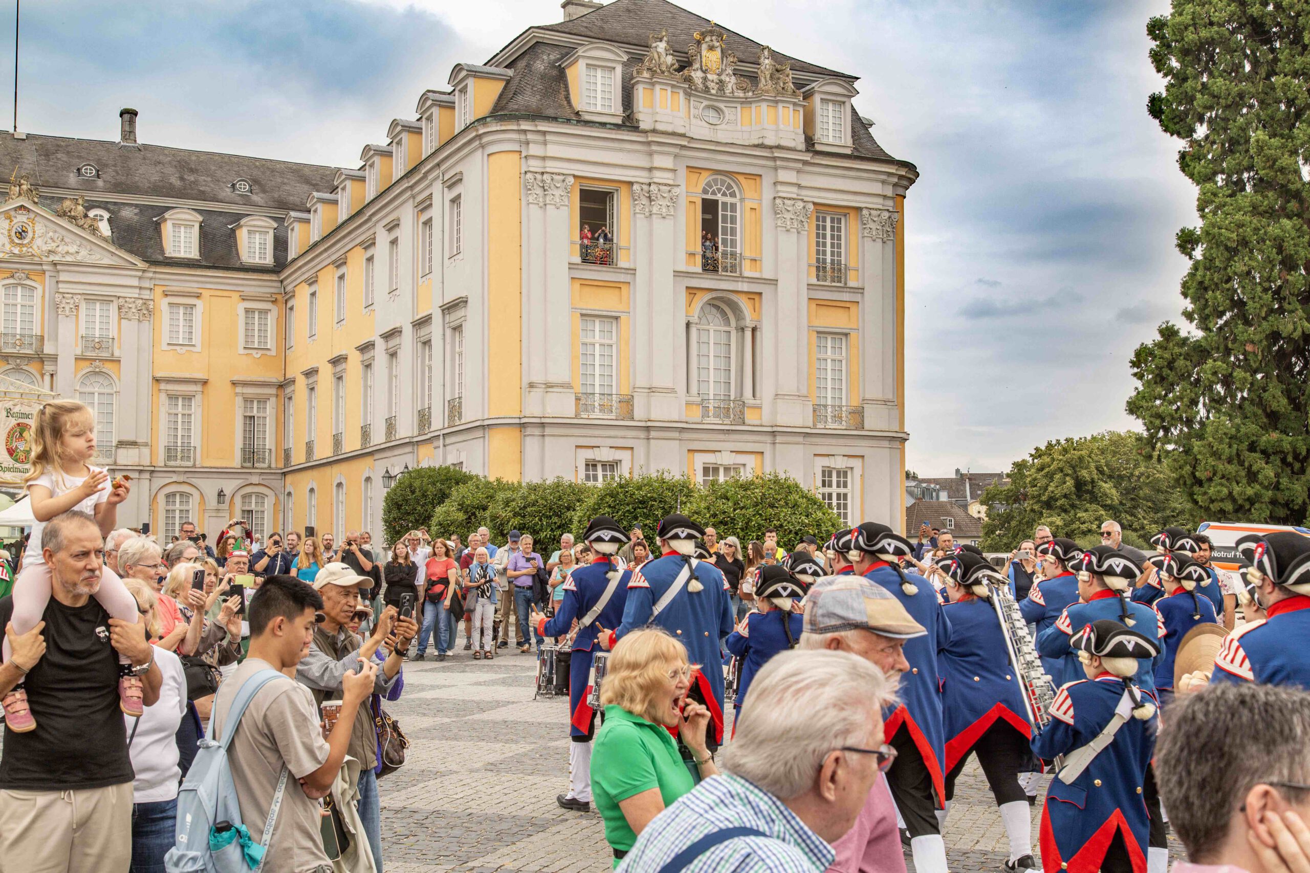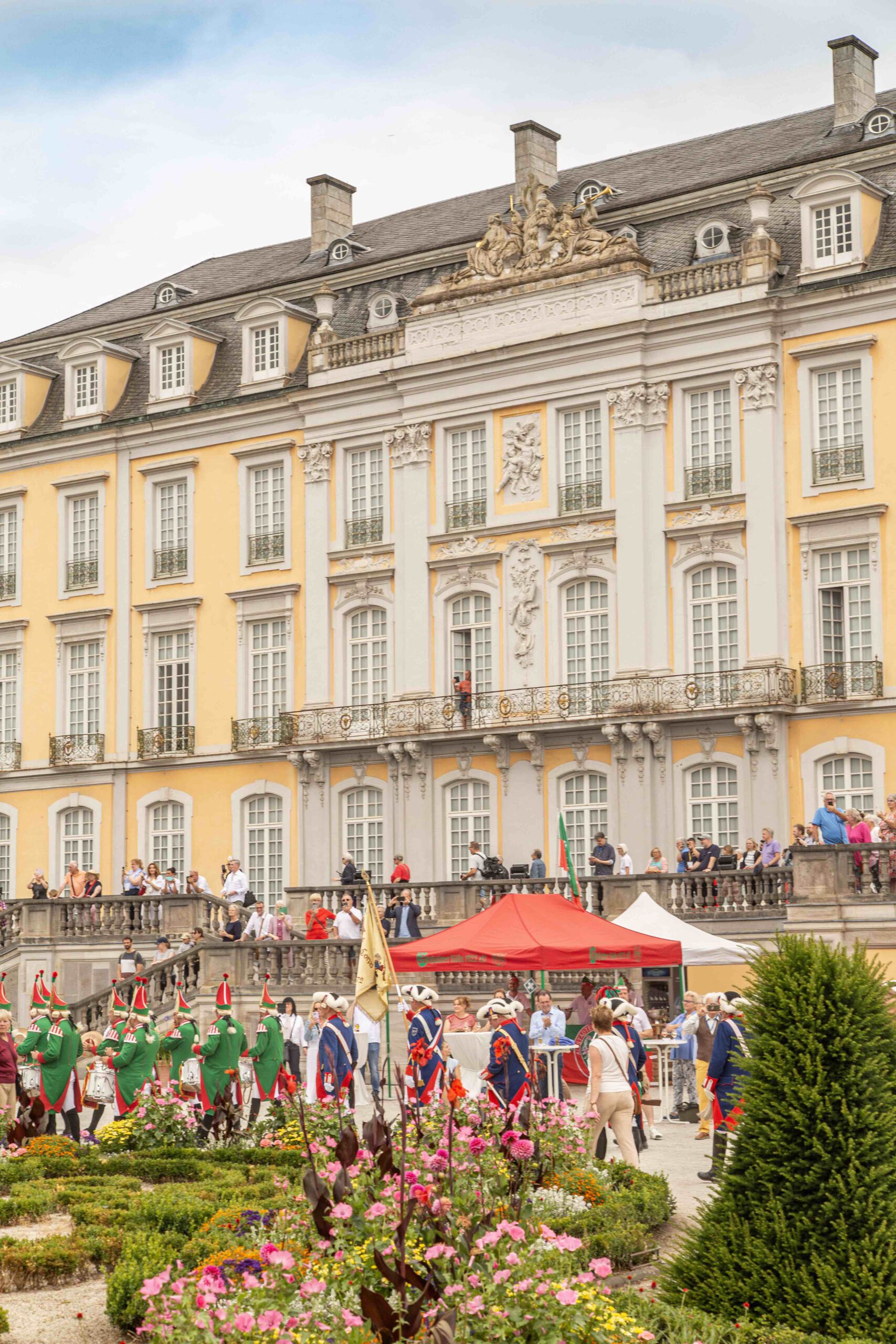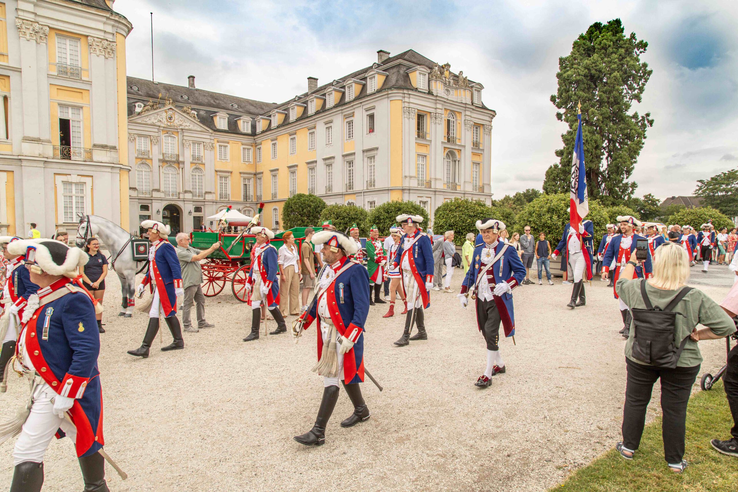 Das Bonner Stadtsoldaten-Corps von 1872 e.V. und die Altstädter Köln 1922 e.V. sind gemeinsam als Kurfürstlich/Kurkölnischer Knubbel Mitglied im „Freundeskreis Brühler Schlösser und Gärten e.V.“ Beiden Korps war es ein Anliegen, zum Gelingen des Aktionstags im Schlossgarten beizutragen: In „Großer Uniform“ stellten die beiden Traditionskorps Wachen an den Eingängen zum Schloss und flanierten im Schlossgarten. Mit „klingendem Spiel“ zogen die beiden Regimentsspielmannszüge gemeinsam auf. Historische Kutschen aus dem Bestand der Traditionskorps rundeten das farbenprächtige Bild vor dem Schloss ab.